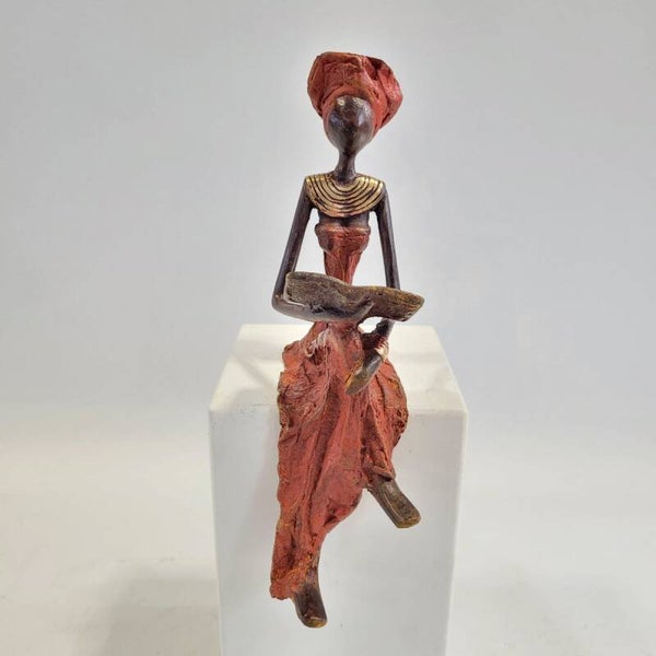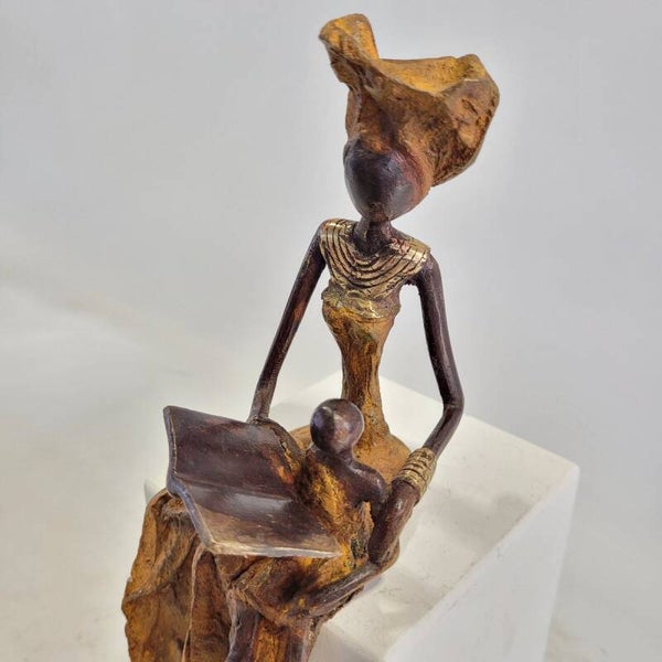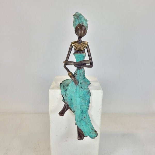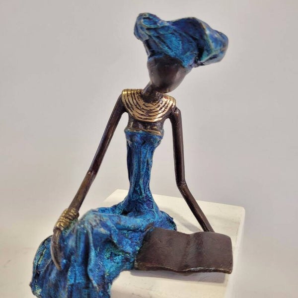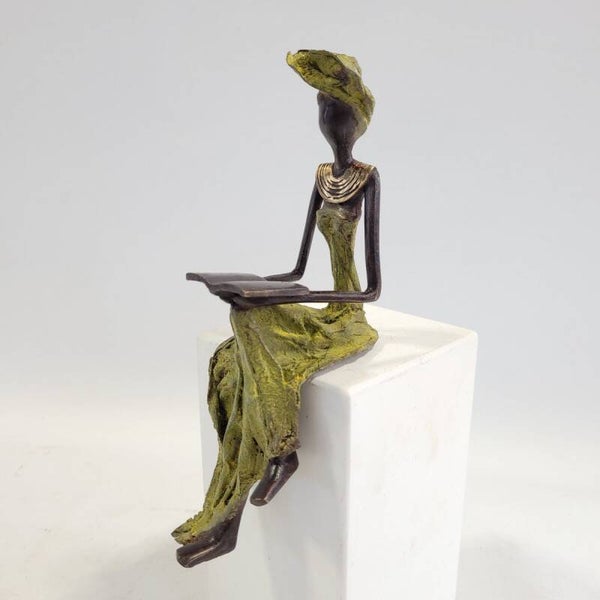 Dit elegante bronzen beeld is gemaakt door de Burkinese kunstenaar Adama Ouedraogo. De lezende vrouw is een symbool van geleerde en sterke vrouwen in Afrika.